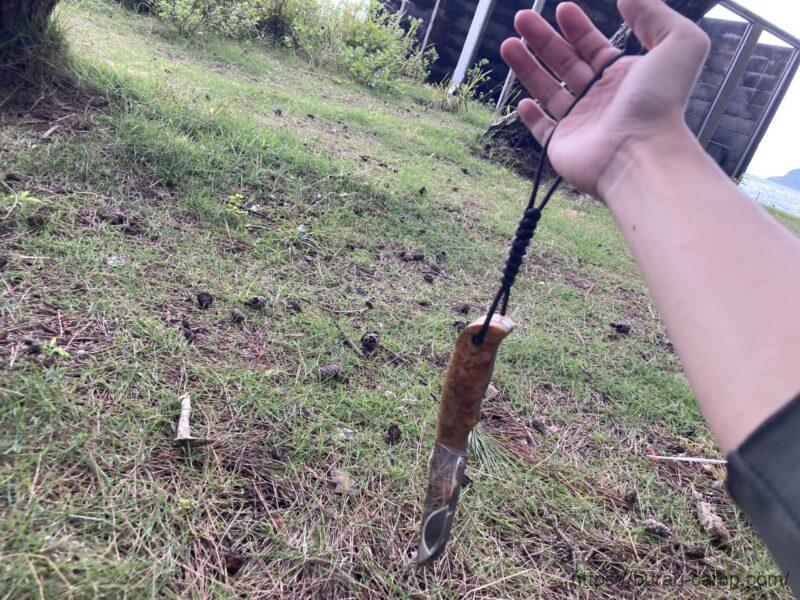 昼食後、今回買ったパラコードでナイフのストラップを編んでみました。