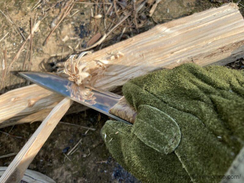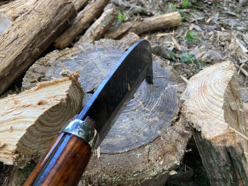 石付きで刃を傷める事なく、切れ味も長持ち。薪のサイズ次第でナイフと使い分けています。