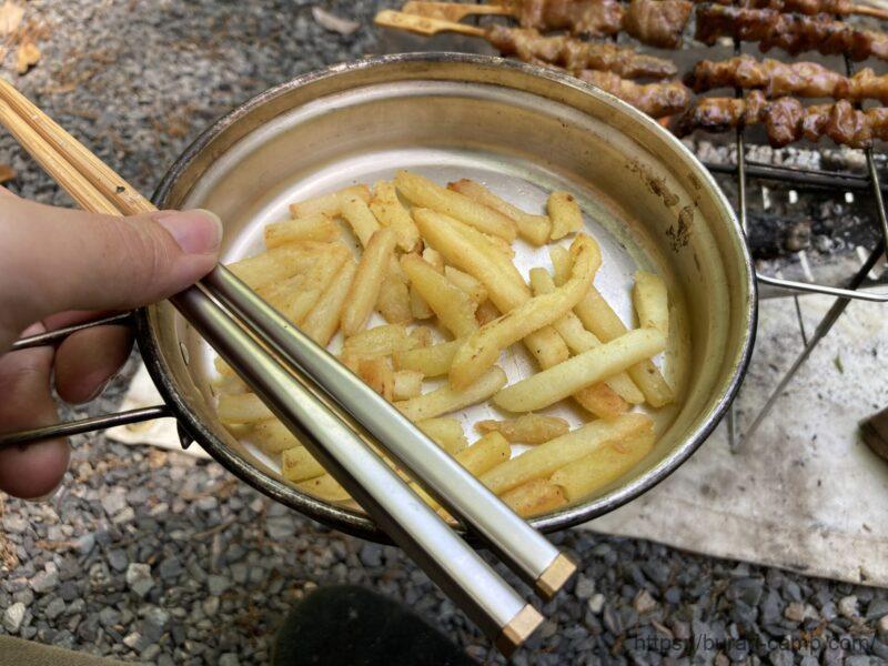 ちょっとゆっくりした後は、おすそ分けのポテトを貰いつつ、つまみの焼き鳥を炙ります。