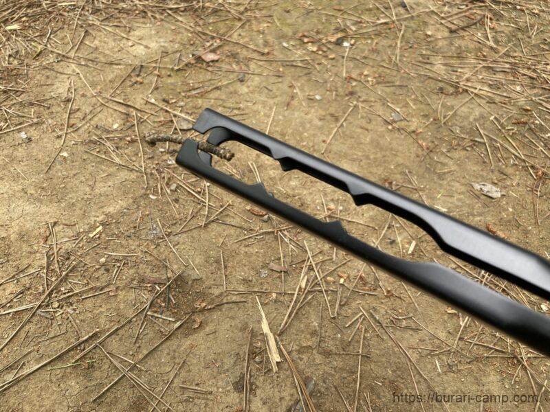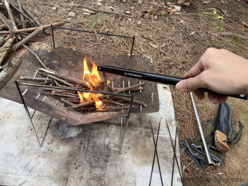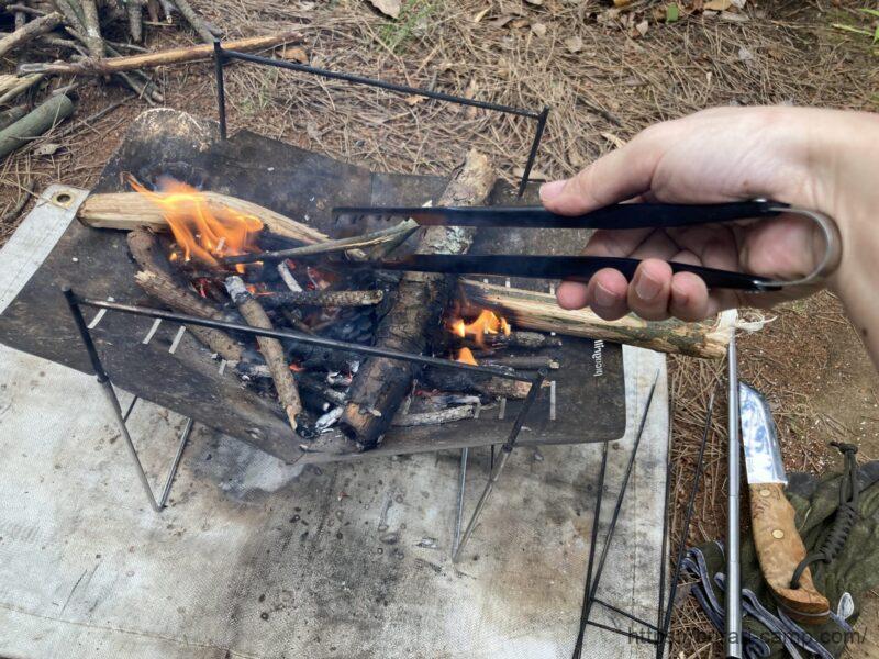 焚き火で薪の位置調整に便利な火バサミ。突き詰めれば無くても良いギアですが、やはりあると便利ですね。
