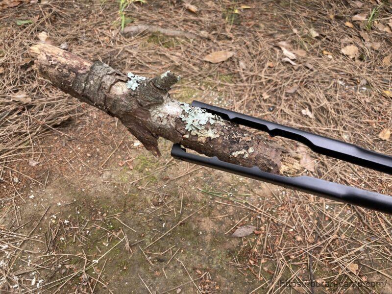 UL Hibasamiは扱いやすいトングタイプになっており、大きい薪もガッチリ掴める強度を備えます。