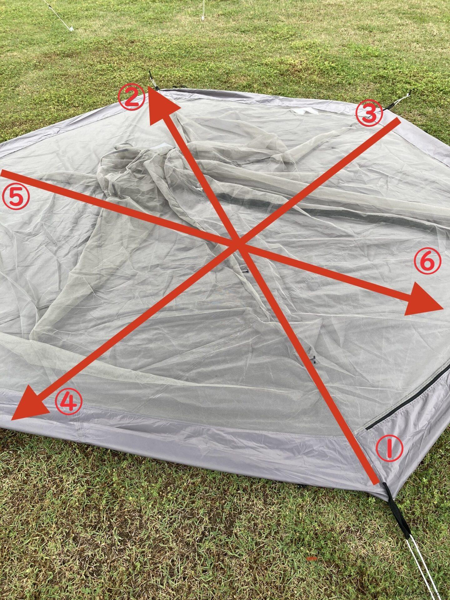 実物のテントを使って説明すると、このような順番でペグを打ち込みます。