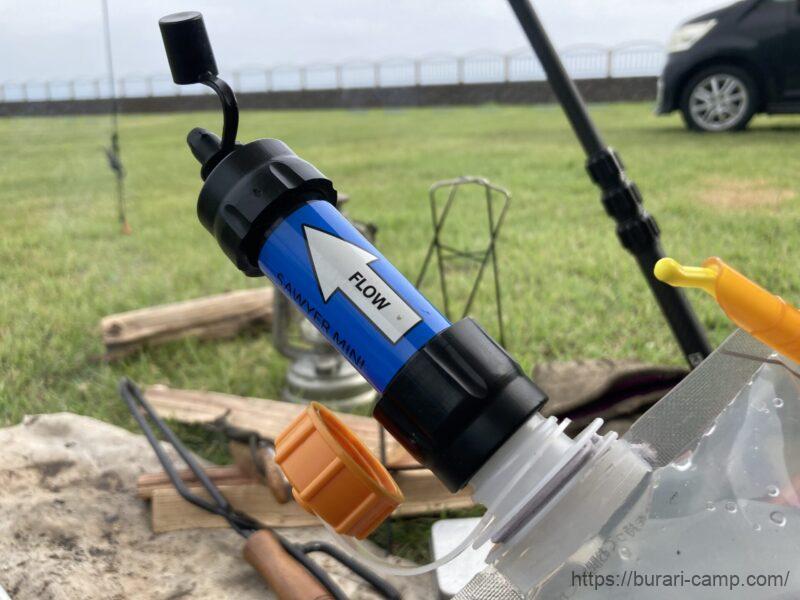 水は”エバニュー ウォーターバッグ”で現地調達しソーヤーで浄水。軽量キャンプの大敵である重い水もこれなら問題ありません。