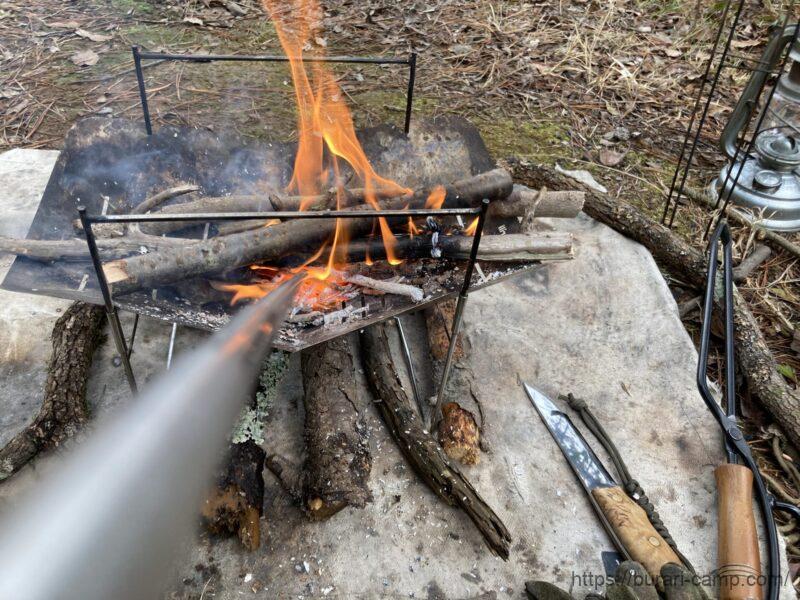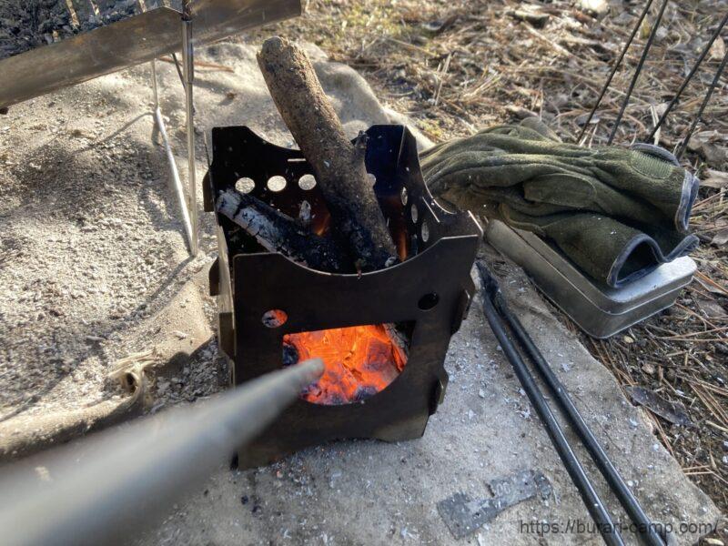 ”ポケットふいご“でどう火の勢いが変わるかの確認。結論から言うと、軽く吹くだけで鎮火した薪が一瞬で燃え上がりました