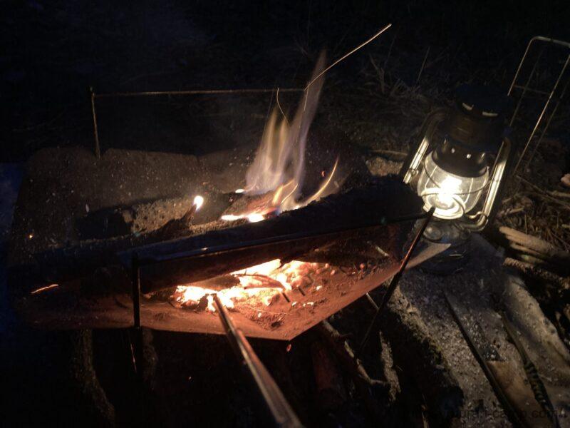 雨で湿った薪もこの通り。無駄なくピンポイントに空気を送れるため、火種さえあればすぐに炎が復活します。先端で細かい薪を弄ったりもできますね。