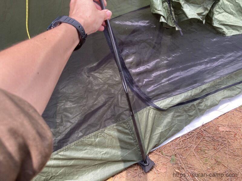 テント扉を開けてポールを先端・下部の穴へ差し込みます。