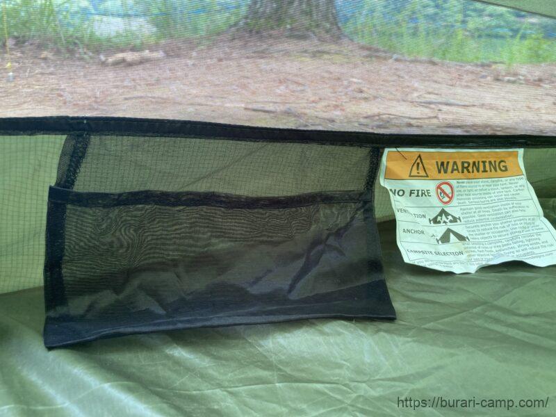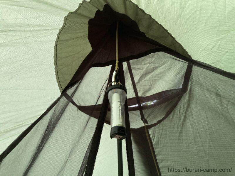 室内に小型の収納ポケット、天井付近にはランタンを吊るせるフックが一つずつあります。