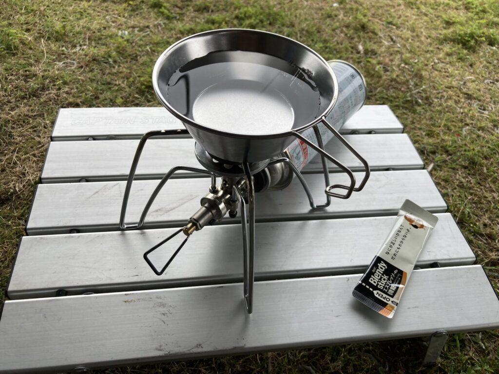 まずは基本の湯沸かしで使用。シェラカップ一つあれば、どこでもコーヒーを楽しめますね。風にも影響されず約3分で沸騰。