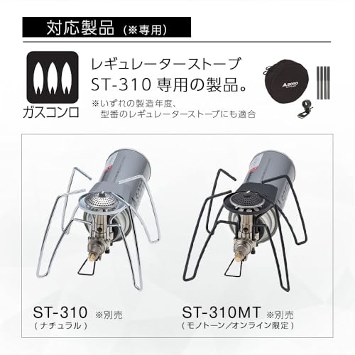 アウトドア用品製造販売会社SOTOから発売されている高火力シングルバーナーST-310。新開発のマイクロレギュレーターを搭載し外気温に左右されない安定した高火力。連続調理時も火力が落ちる事の無い造りになっています。生ガスが発生しにくい構造や大型のゴトクを搭載。安定した調理を行え季節や場所を問わず使用する事が出来ます。